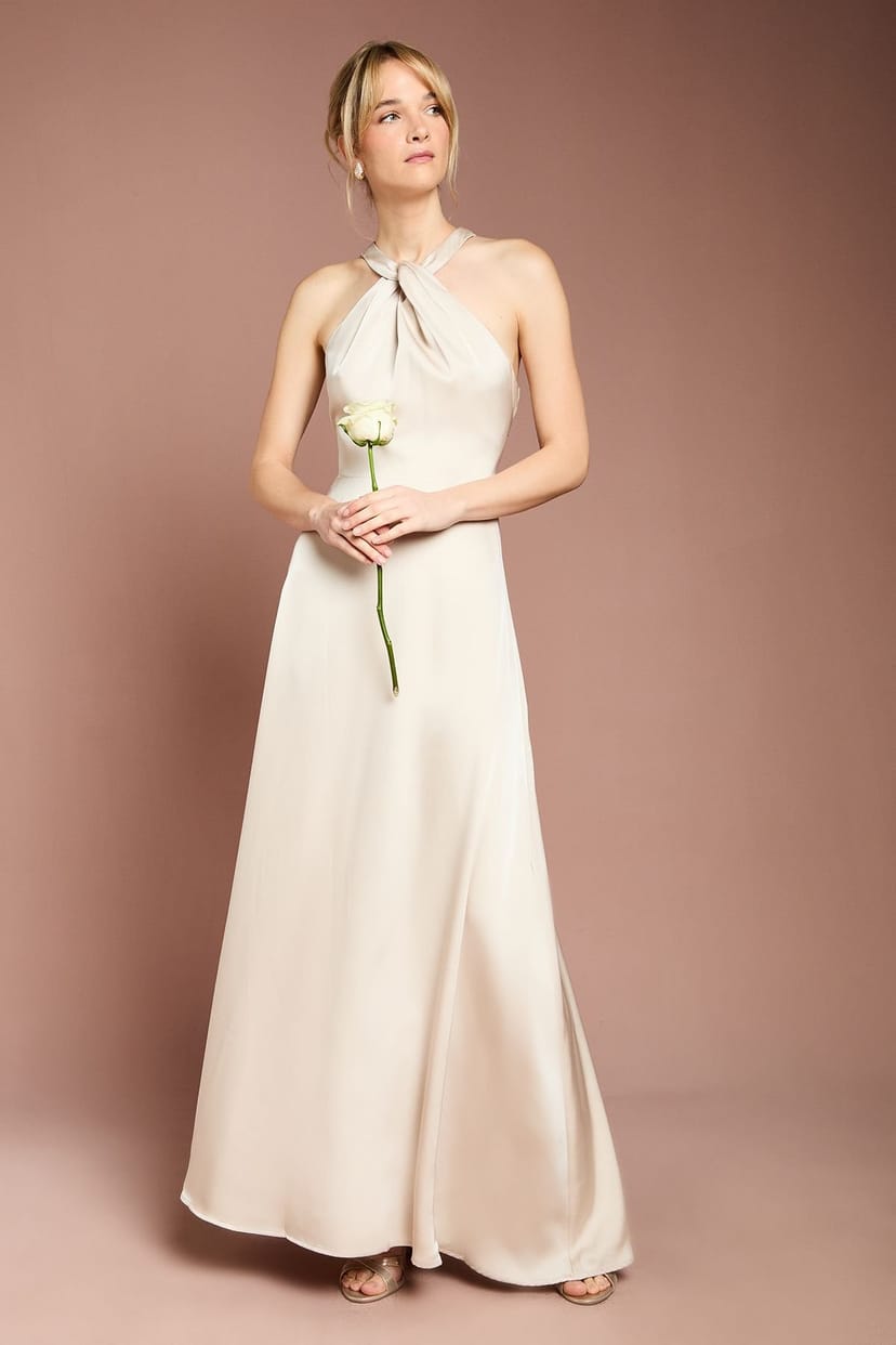 Exquisite Champagne satin bridesmaid dress with a twist halterneck and A-line silhouette. Features a self-tie belt at the waist and a floor-sweeping length. Fully lined for a smooth fit.
