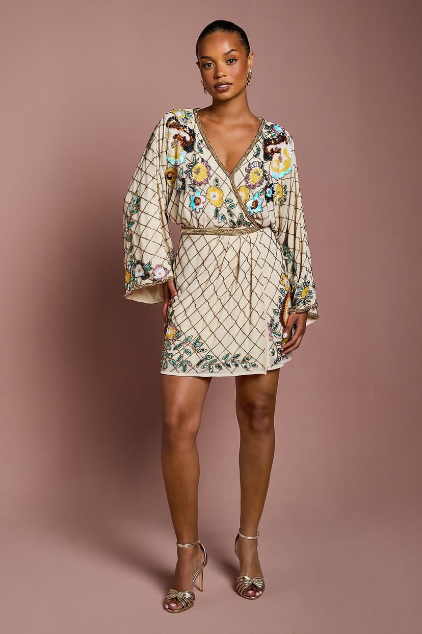 Exquisite hand-stitched floral embellishments create a stunning visual impact across the Champagne mini dress. Elegant wrap-style bodice with a flattering V-neckline that frames the décolletage beautifully. Dramatic wide sleeves with a kimono-inspired silhouette for a touch of contemporary glamour.