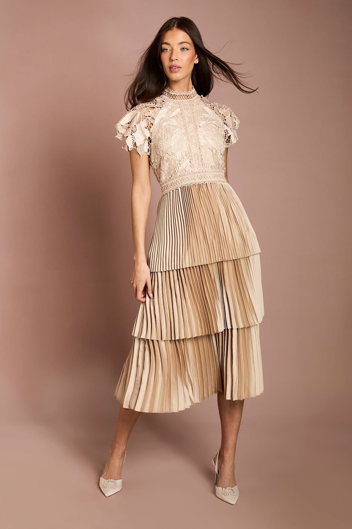 Exquisite lace bodice with intricate detailing and high neckline for sophisticated elegance. Delicate flutter sleeves adding a romantic touch to the silhouette. Striking three-tiered pleated satin skirt creating dramatic movement and dimension. Midi-length design falling gracefully to mid-calf for a contemporary look.