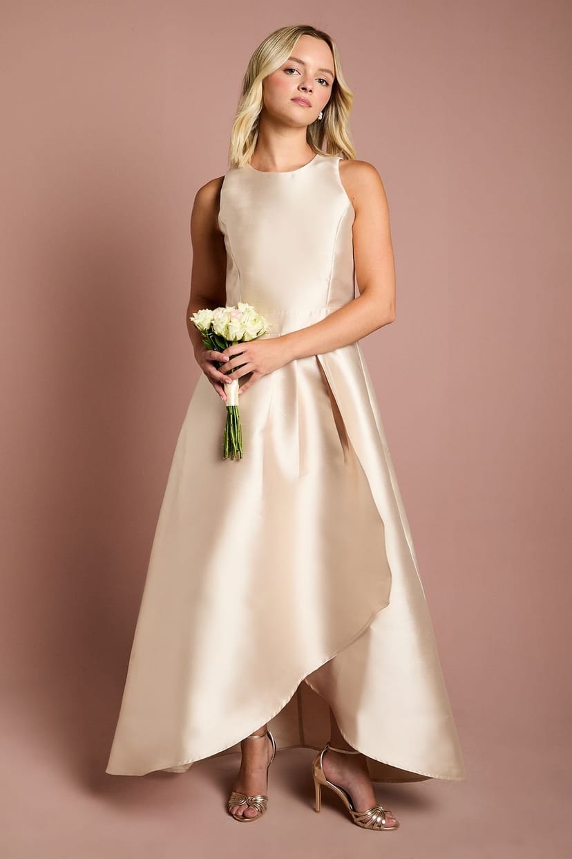 The Coast Champagne Twill Waterfall Bridesmaid Dress is available in sizes 14-15 years.