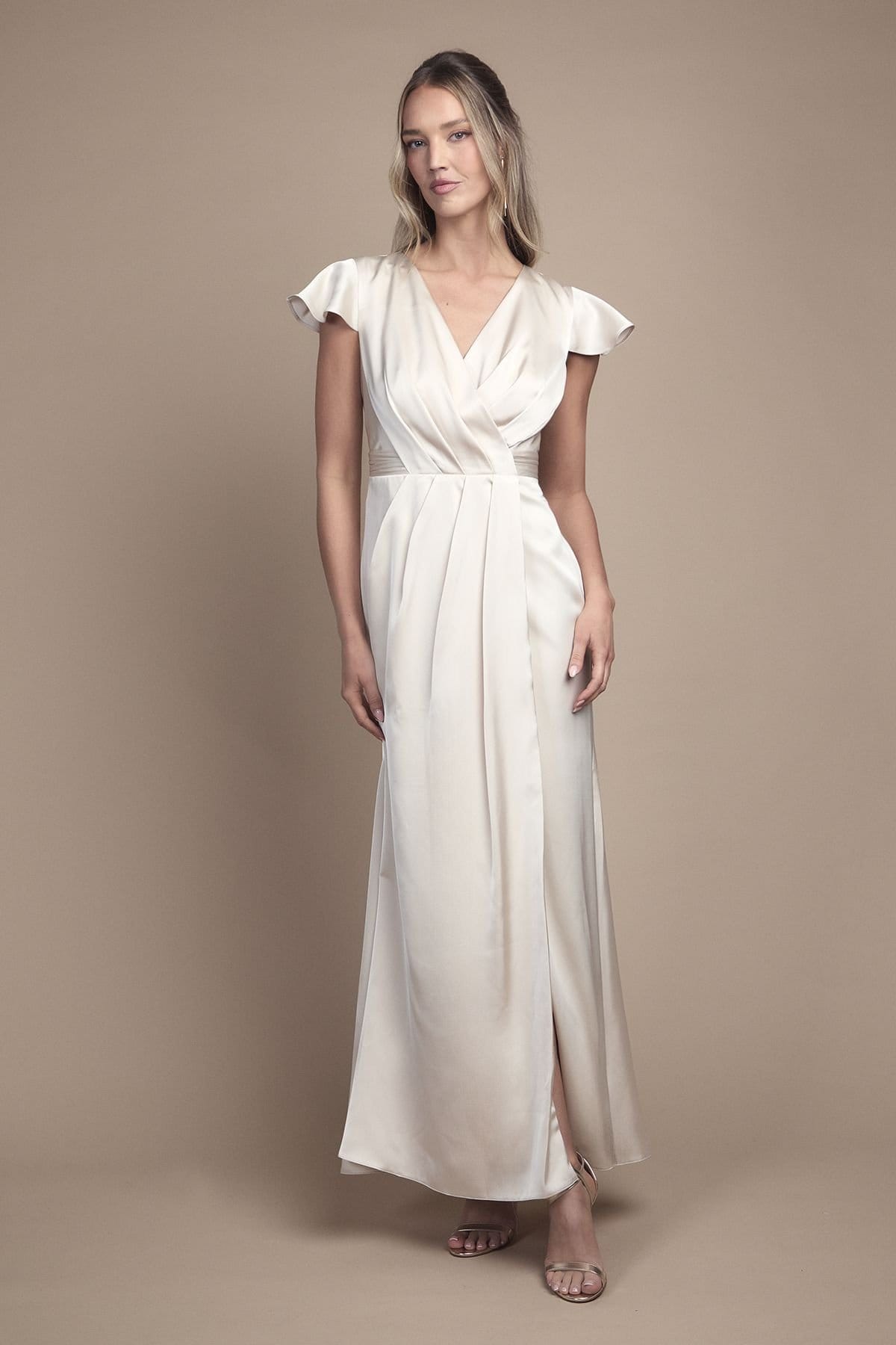 The Coast Champagne Satin Wrap Front Maxi Bridesmaid Dress is available in sizes 10, 12, 14, 16, 8.