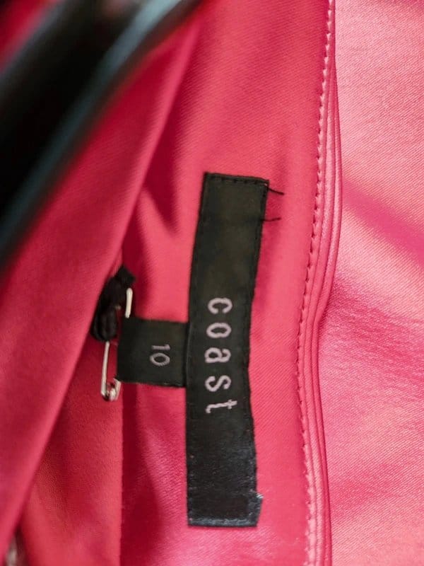 Brick Red Satin Corset Dress by Coast — a stunning, fully lined and boned strapless dress with removable straps. Designed in brick red matt satin, this fitted size 10 dress features a concealed side zip for a perfect fit. Comes with matching cami straps for versatile styling. Ideal for special occasions and evening events.