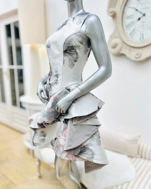Silver Floral Print Jacquard Dress — the must-have occasion dress for wedding guests, evening events, dinner parties. Designed in vibrant silver, this fitted dress features a statement frill skirt, and a floaty silhouette for a flattering fit. Crafted from lightweight jacquard with metallic fibre, it catches the light beautifully. Includes a full-length lining for comfort and coverage.