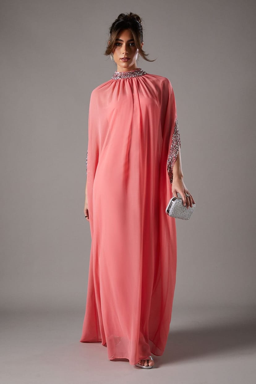 Stunning coral chiffon cape-style maxi dress. Exquisite sequin and bead embellishments along neckline and cape edges. Elegant high neck design. Flowing, floor-length silhouette. Perfect for formal occasions.