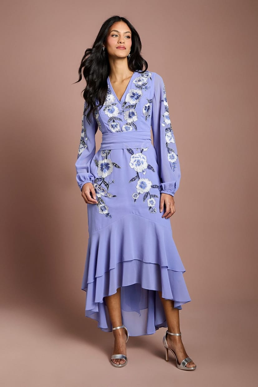 The Coast Cornflower Blue Sequin & Embroidery Hi-Lo Maxi Dress is available in sizes 10, 12, 14, 4, 6, 8.