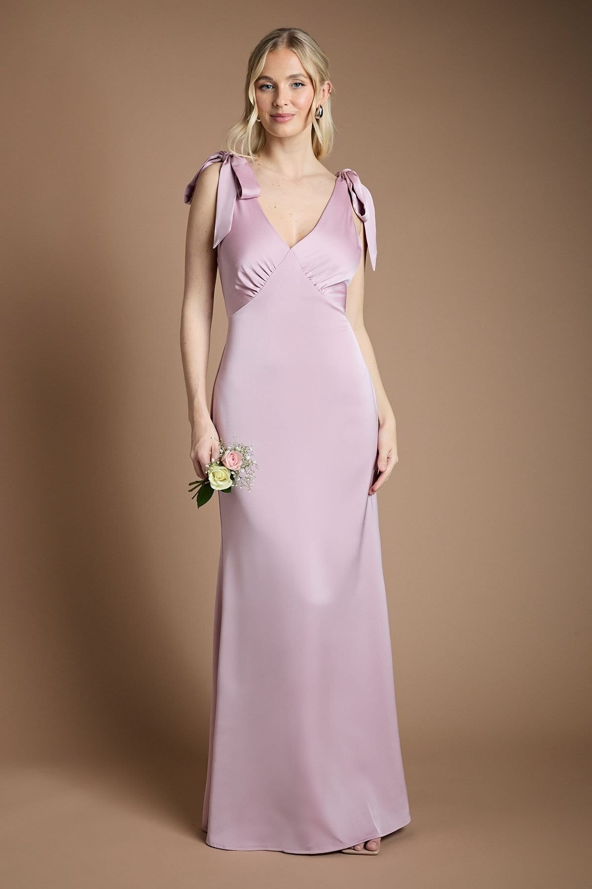 View Debenhams's returns policyElegant satin bridesmaid dress in dusty rose with a flattering V-neckline. Distinctive tie shoulder detail adds a refined touch. Floor-sweeping length perfect for formal bridal party occasions. Subtle gathering at the bust creates a graceful drape.