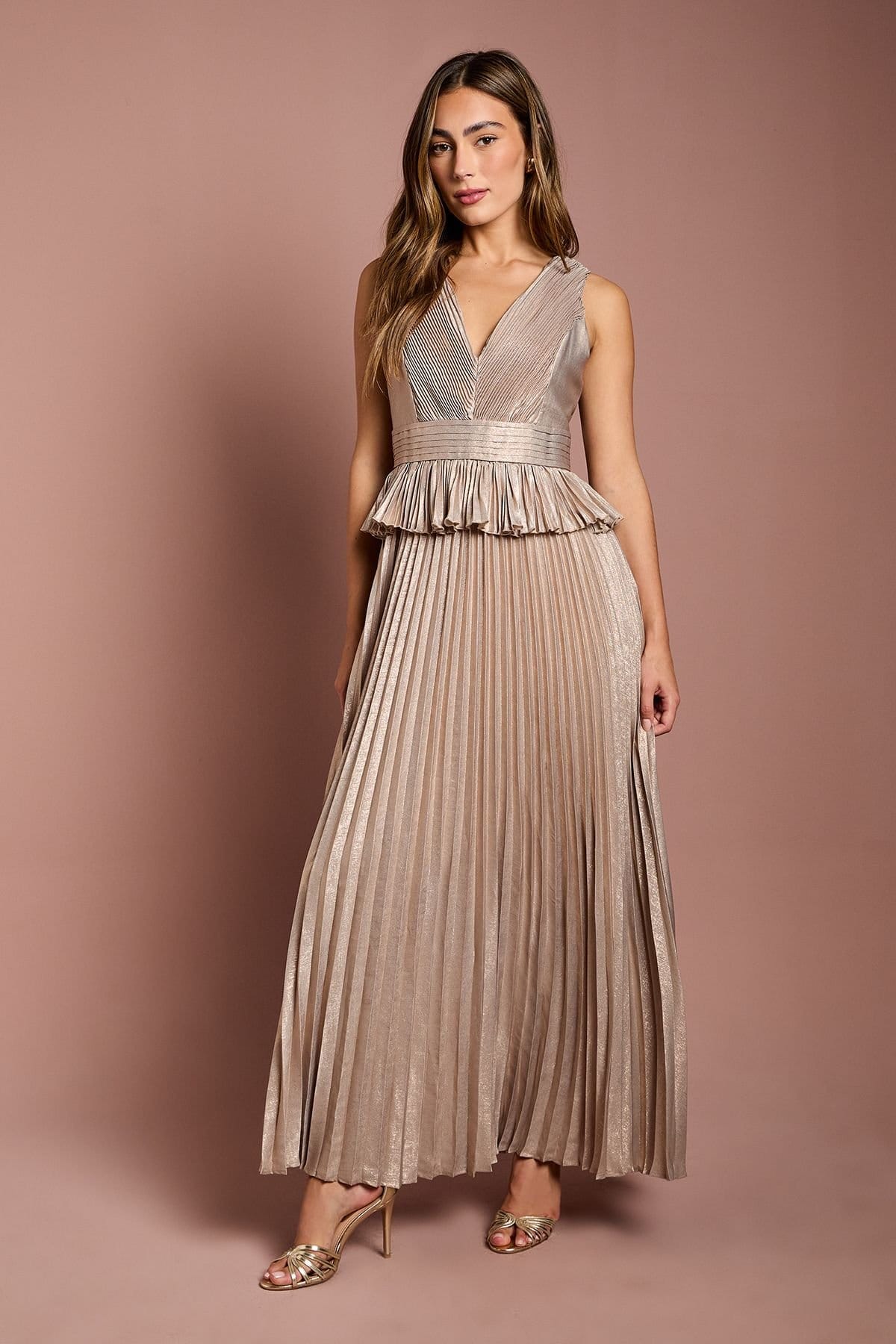 The Coast Gold Metallic Pleated Maxi Dress With Peplum is ideal for evening, party, date-night.