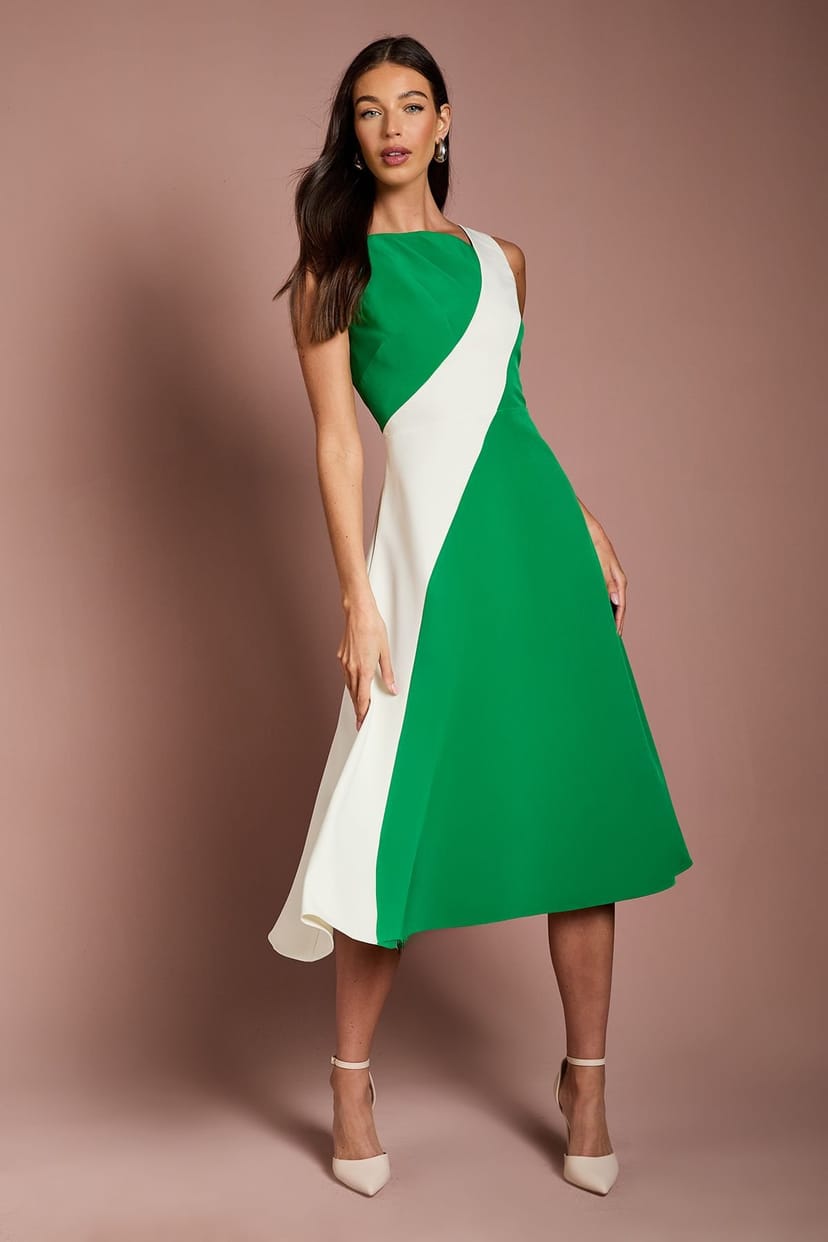 This Coast midi dress features a striking asymmetric neckline and a bold colour block design. Crafted from crepe fabric, it offers a sophisticated simplicity perfect for formal occasions.