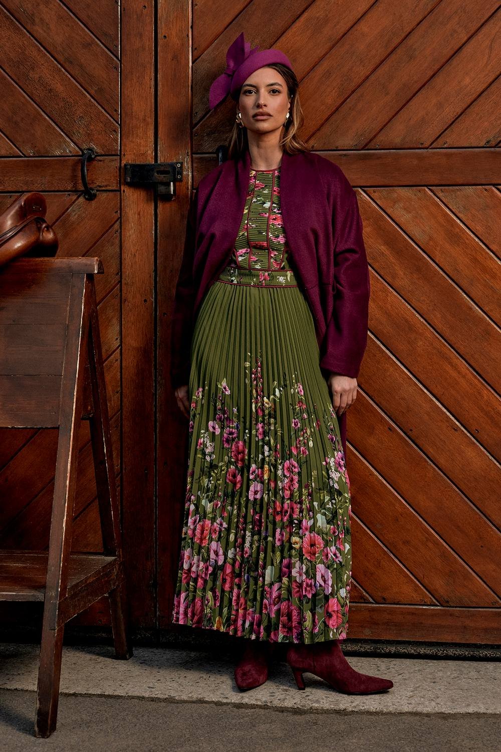 Sophisticated green floral print midi dress with a pleated bodice and piping detail. The round neckline and flowing midi length offer a flattering silhouette perfect for special occasions.