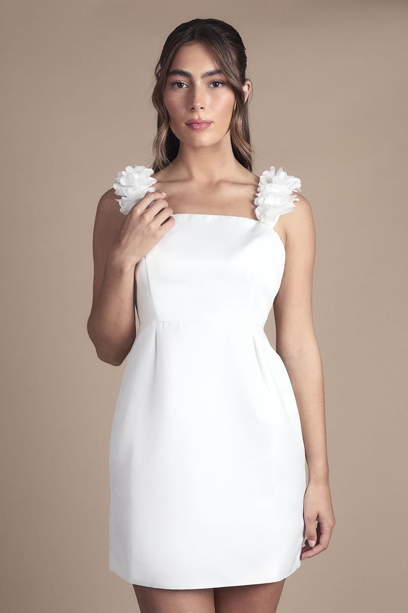 Elegant Ivory satin mini dress with a Bardot neckline and striking 3D floral shoulder details. Sleek silhouette with a structured shape and subtle sheen. Perfect for modern bridal styling.