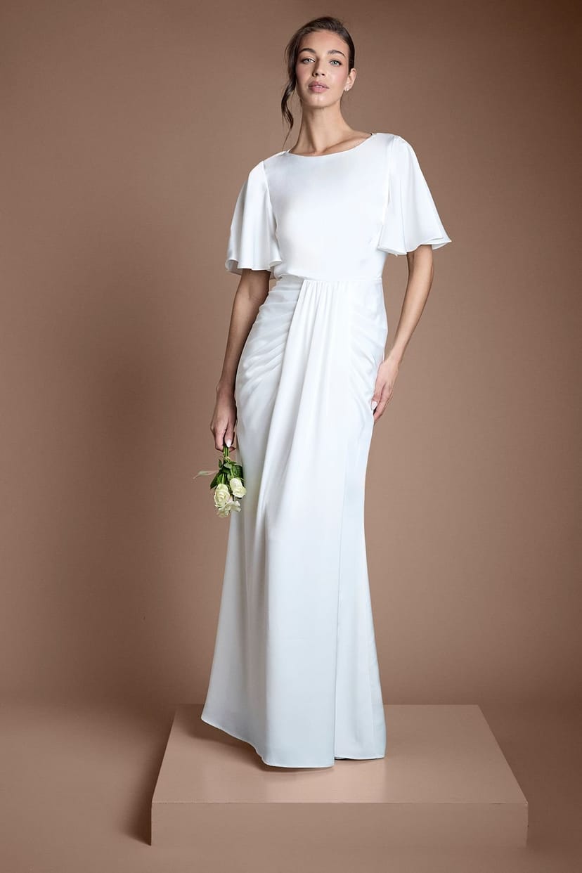 The Coast Ivory Satin Wedding Dress with Drape Details is available in sizes 10, 12, 8.