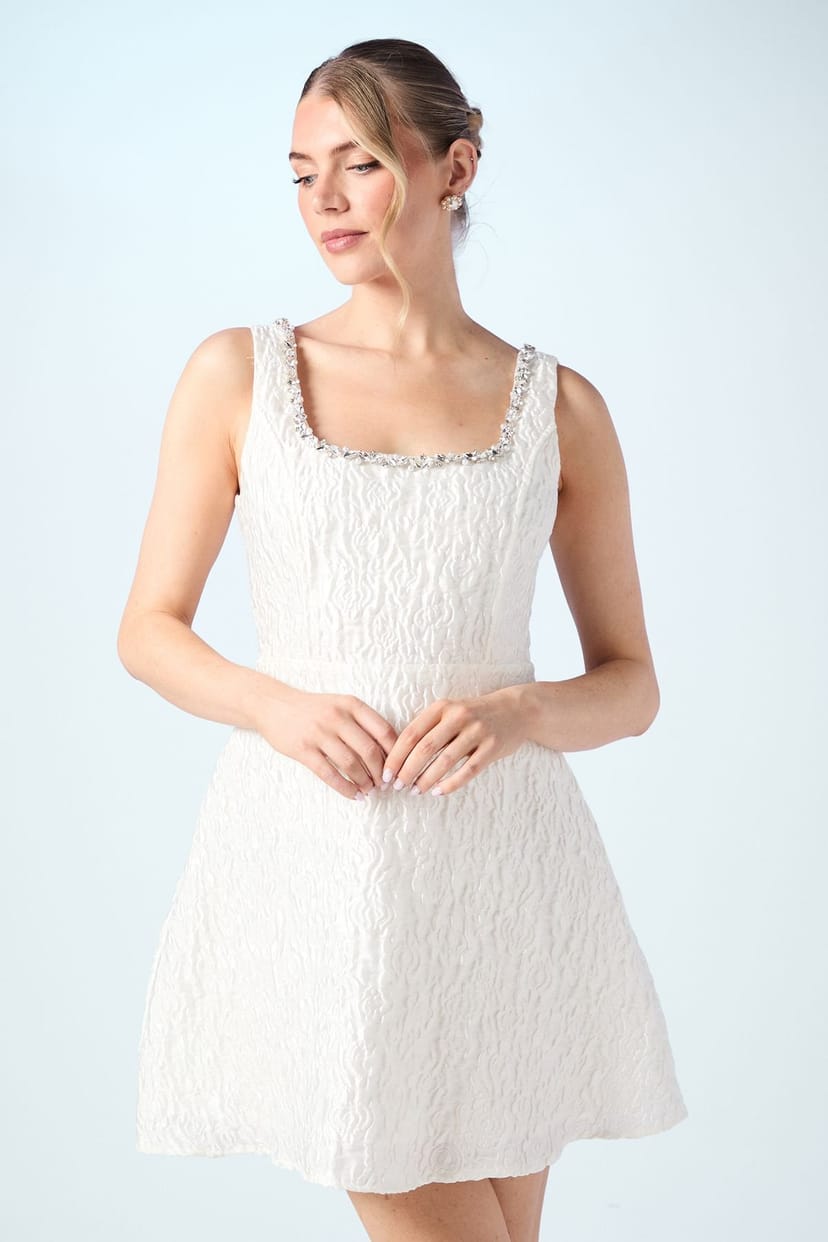 The Coast Ivory Jacquard Full Skirted Mini Dress With Jewel Trim is available in sizes 10, 12, 14, 16.