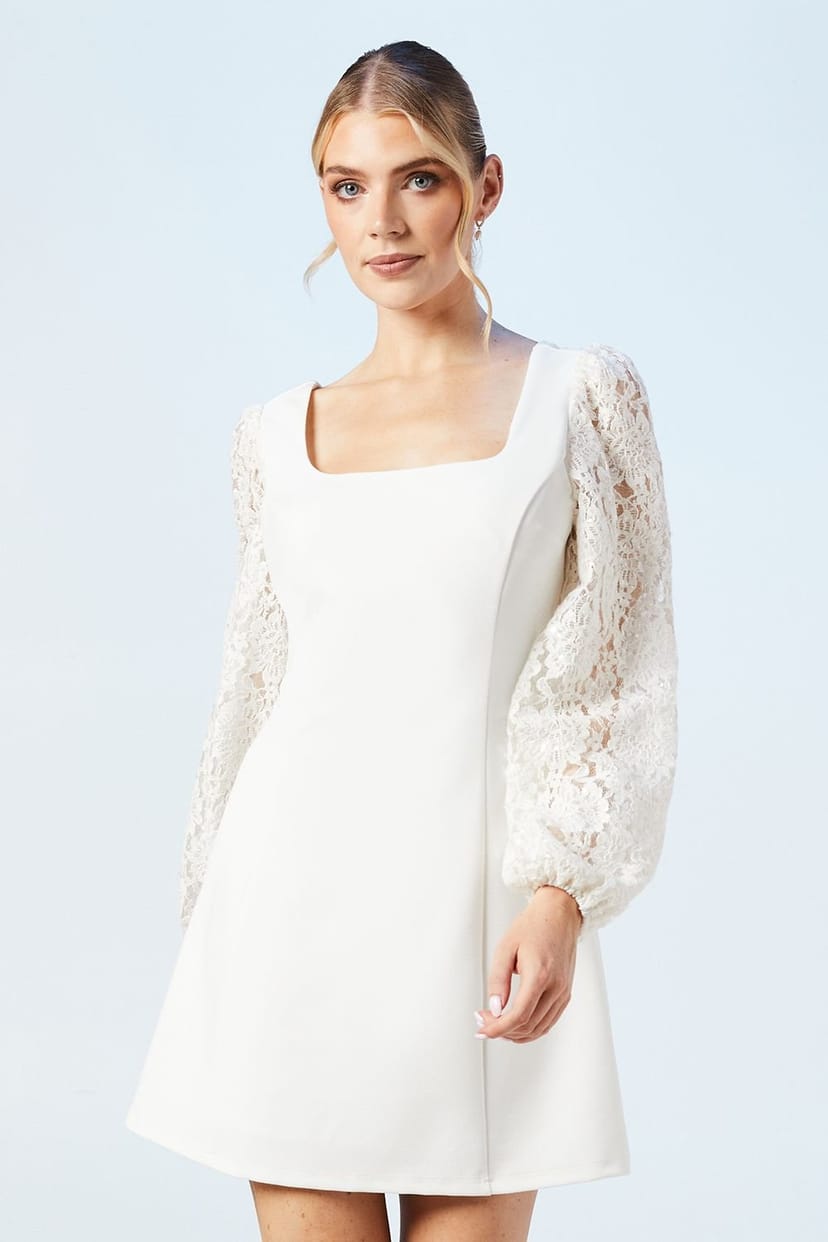 Sophisticated ivory mini dress with a square neckline. Lace sequin sleeves add glamour. Scuba crepe fabric offers a structured silhouette. Ideal for bridal events.