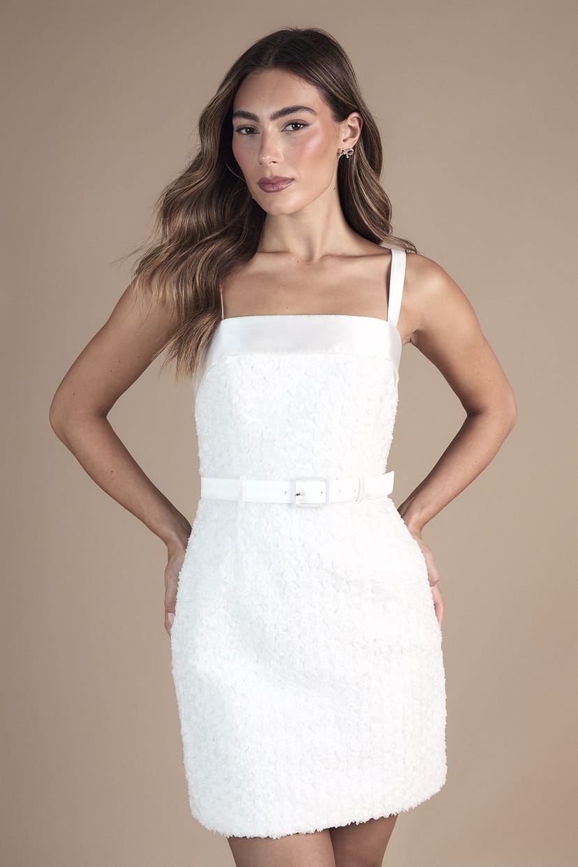 Elegant ivory mini dress with a square neckline and delicate strappy details. Features stunning all-over embellishments for a luxurious finish. The coordinating belt cinches the waist, perfect for a sophisticated bridal look.