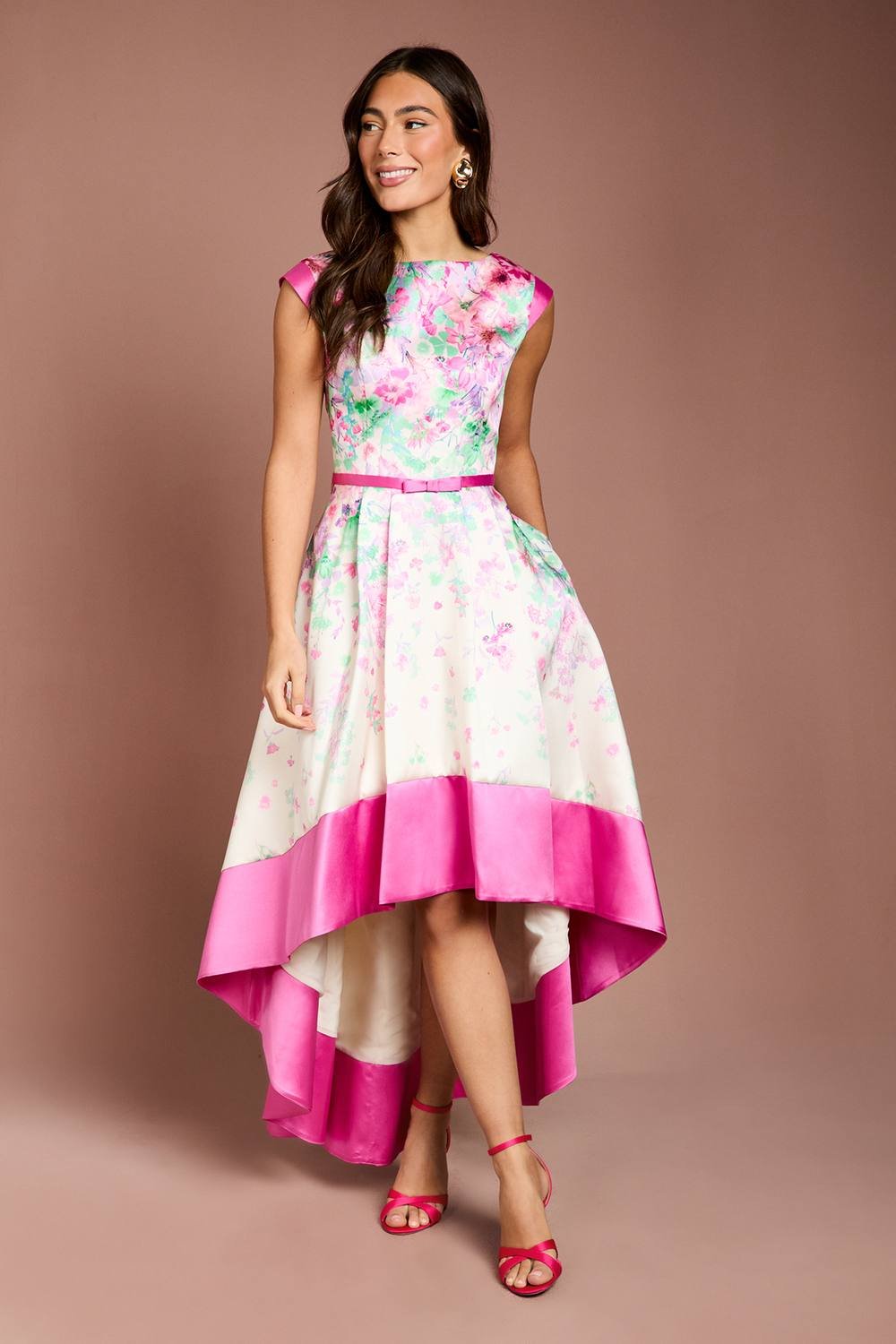 Striking hi-lo hemline creates a dramatic silhouette perfect for special occasions. Elegant round neckline frames the dcolletage beautifully. Floral print transition adds a captivating touch.
