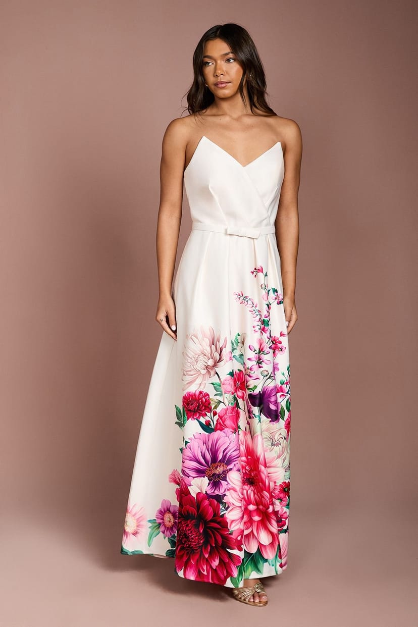 View Debenhams's returns policyThis Ivory maxi dress by Coast features a striking bandeau neckline with wired support for elegant structure. The dramatic floral print adds a bold touch along the hemline. Made from luxurious satin fabric, it offers a subtle sheen perfect for evening sophistication. The floor-sweeping maxi length creates a graceful silhouette, while the delicate waist tie detail adds definition.