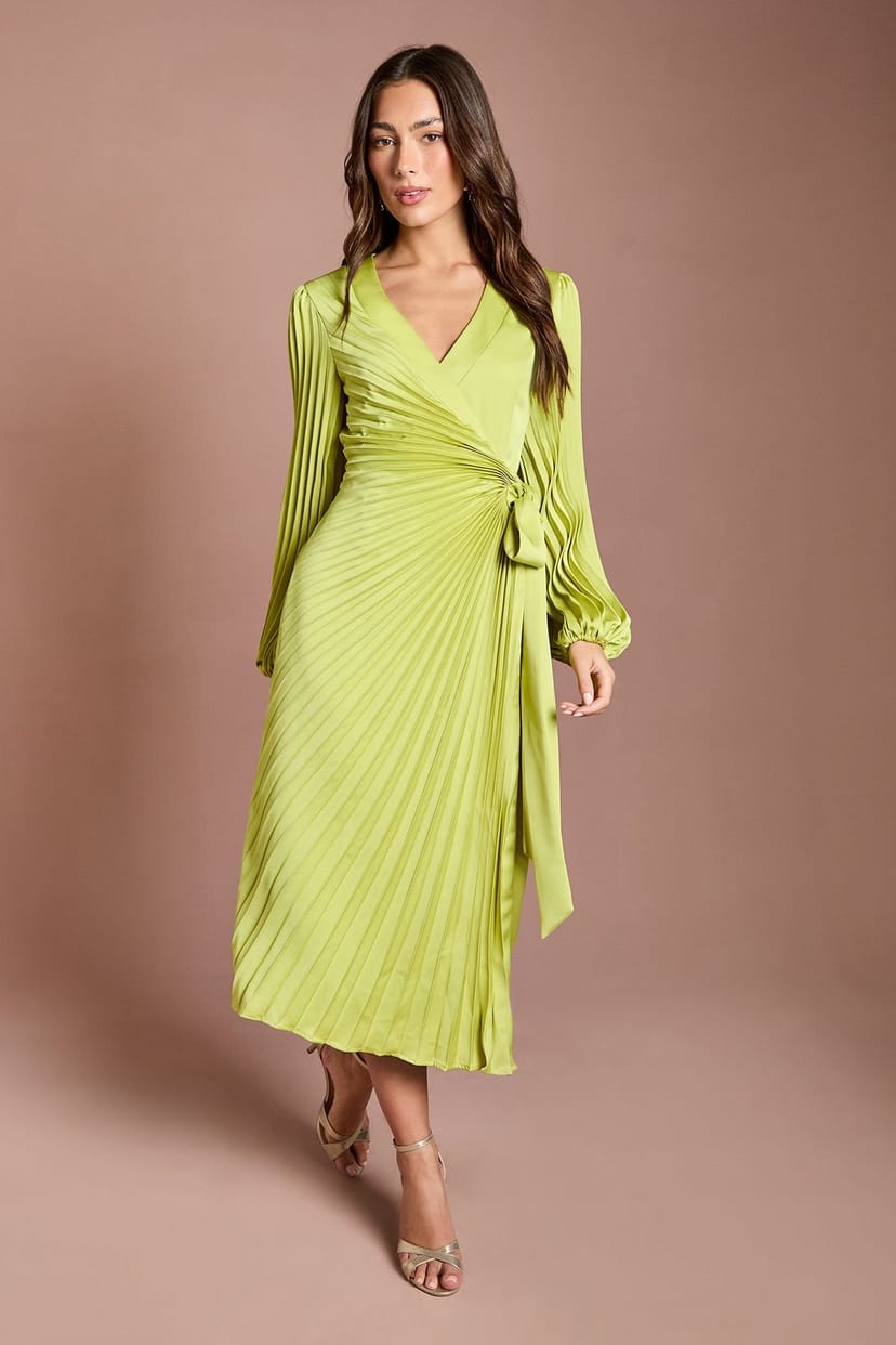 The Coast Lime Satin Pleated Wrap Dress is made from satin.