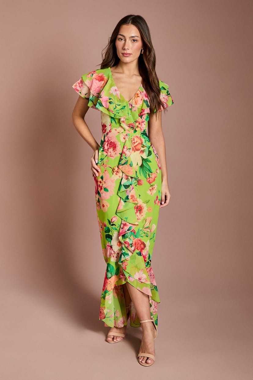 The Coast Lime Floral Print Chiffon Maxi Dress With Frills is available in sizes 10, 12, 14, 16, 18, 8.
