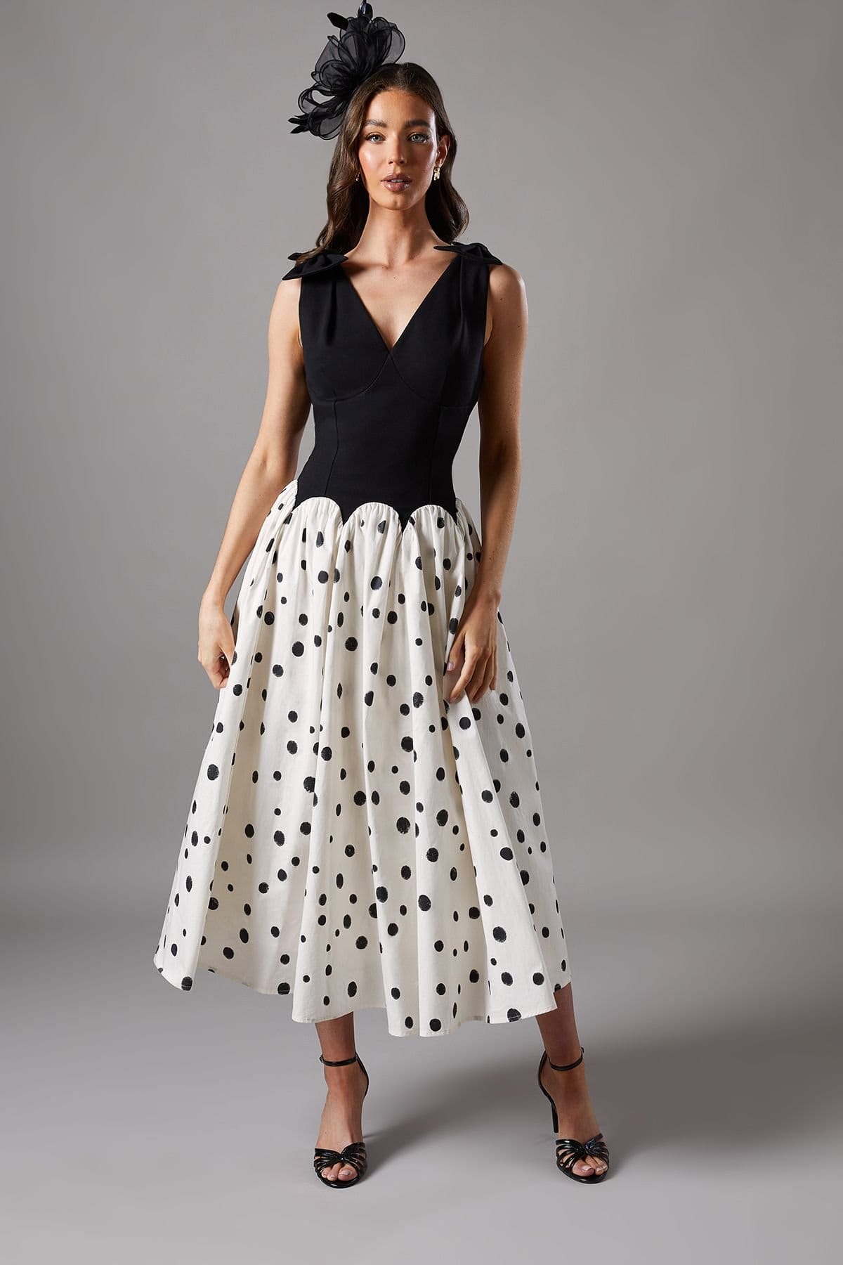 This monochrome polka dot midi dress features a drop waist silhouette with a contrasting bodice and skirt design. The charming bow detail on the shoulders adds a feminine touch, while the flattering V-neckline beautifully frames the décolletage. The midi length skirt boasts a playful polka dot pattern, and the sophisticated open back design completes the look.