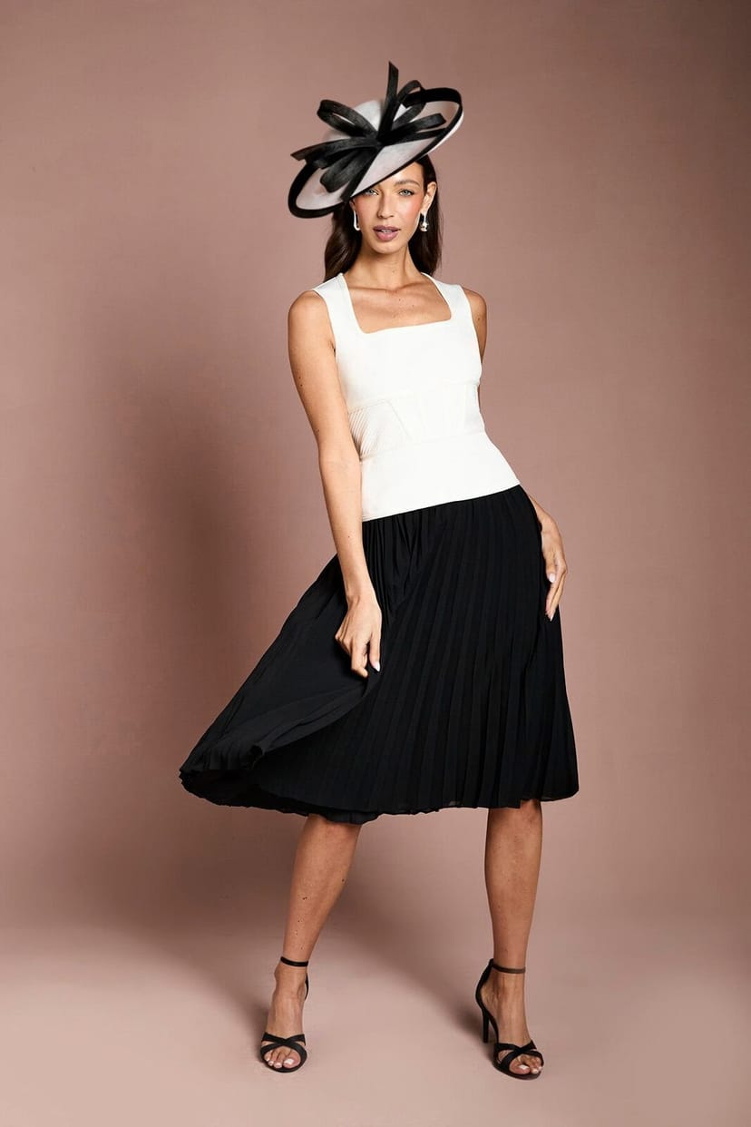 Sophisticated monochrome midi dress with a square neckline and structured bodice. Features a peplum waist for an hourglass silhouette and a flowing pleated skirt. Ideal for elegant occasions.