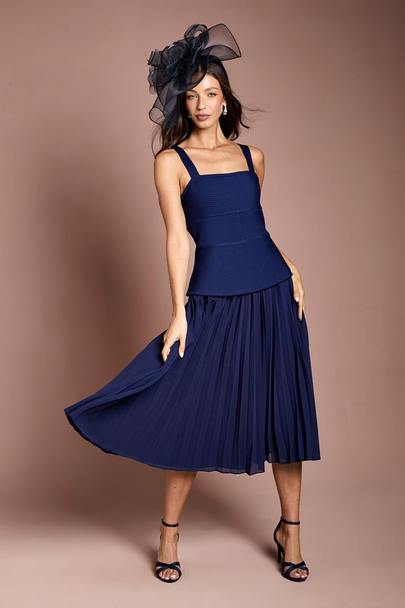 The Coast Navy Bandage Bodice Midi Dress With Pleated Skirt is ideal for evening, formal, party.