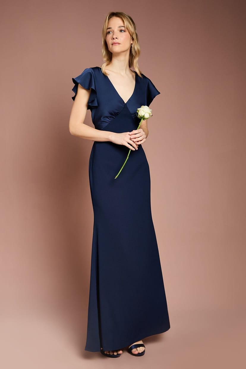 This Navy satin bridesmaid dress from Coast features an elegant V-neckline and graceful angel sleeves with delicate ruffles. The luxurious satin fabric provides a smooth, glossy finish. The floor-length design includes a subtle flare and a cinched waist with a tie-back detail for a customized fit.