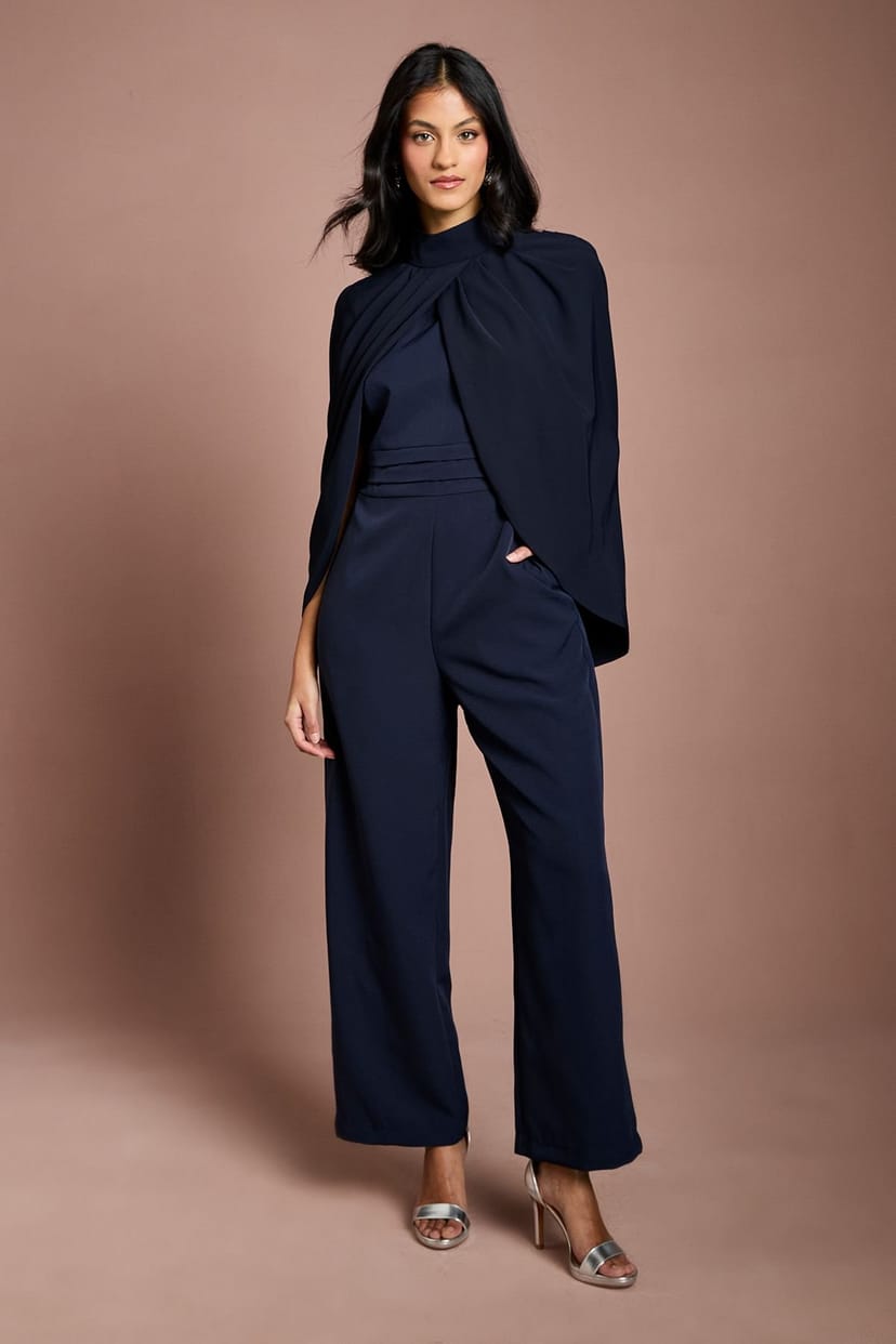 Sophisticated navy crepe jumpsuit with a high neck and cape sleeves. Features a wide-leg cut for comfort and a subtle pleating detail at the neckline. Ideal for formal occasions.