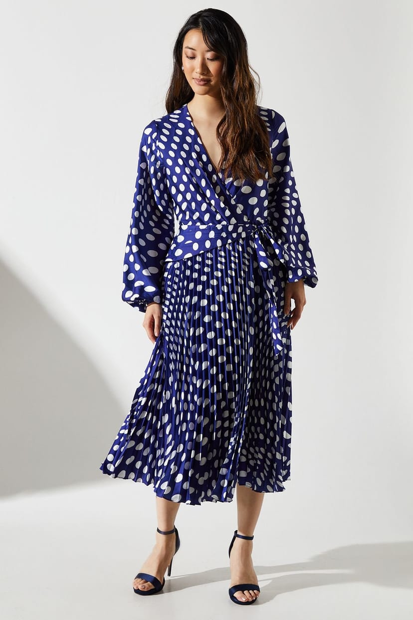 Elegant polka dot wrap dress in navy with a flattering V-neckline and voluminous balloon sleeves. Features a pleated skirt and a waist-defining tie belt for a customisable fit. Perfect for special occasions.