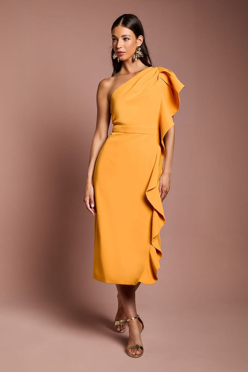 The Coast Orange One Shoulder Ruffle Crepe Midi Dress is ideal for evening, party, date-night.
