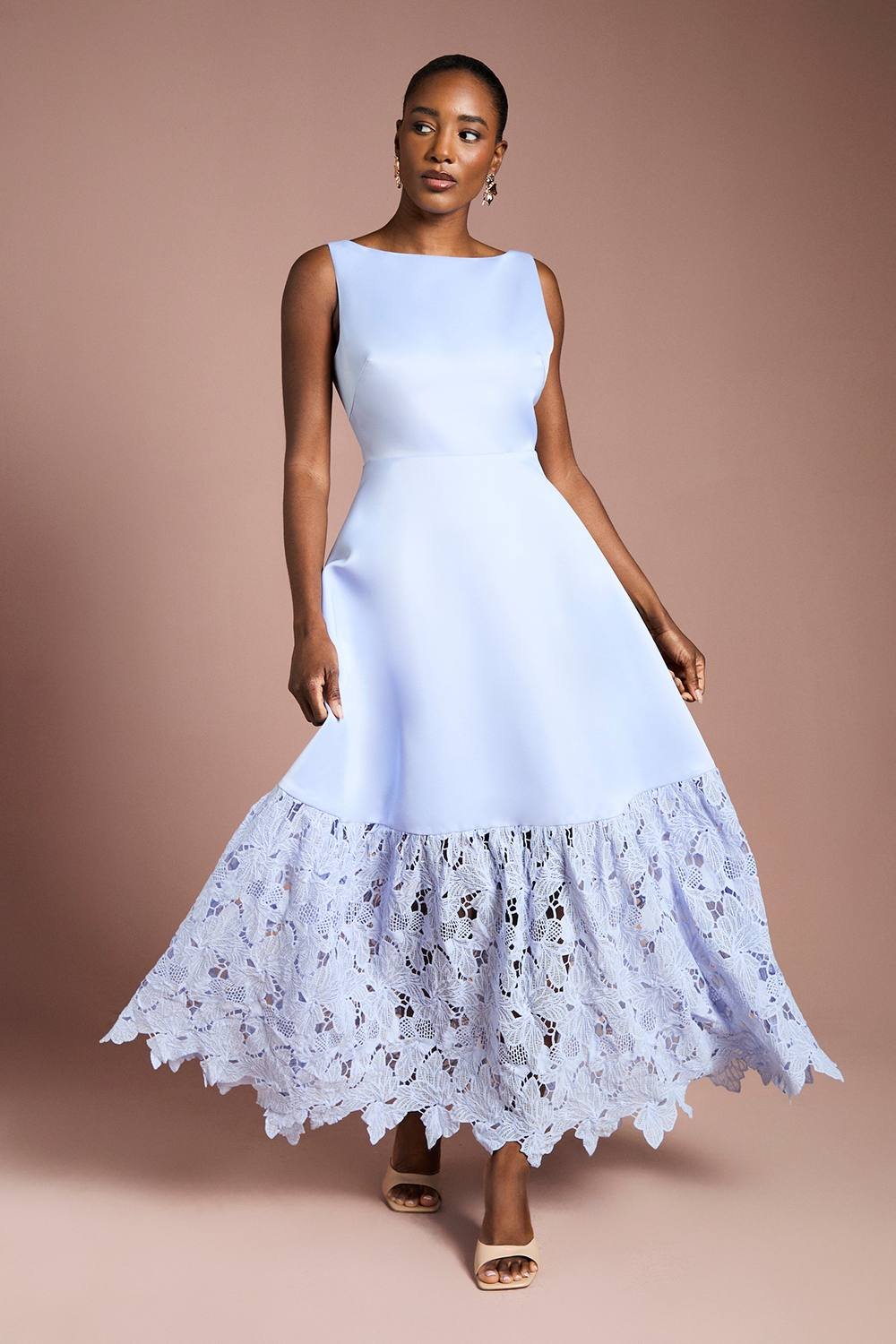 The Coast Pale Blue Satin Lace Hem Maxi Dress is made from satin, lace.