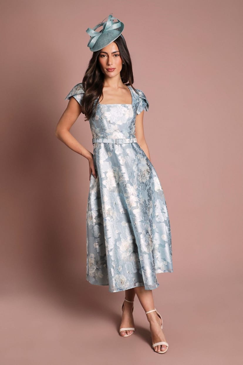 Charming pale blue floral midi dress with a square neckline and cap sleeves. Features a belted waist and a full skirt for a classic look. Ideal for garden parties or summer weddings.