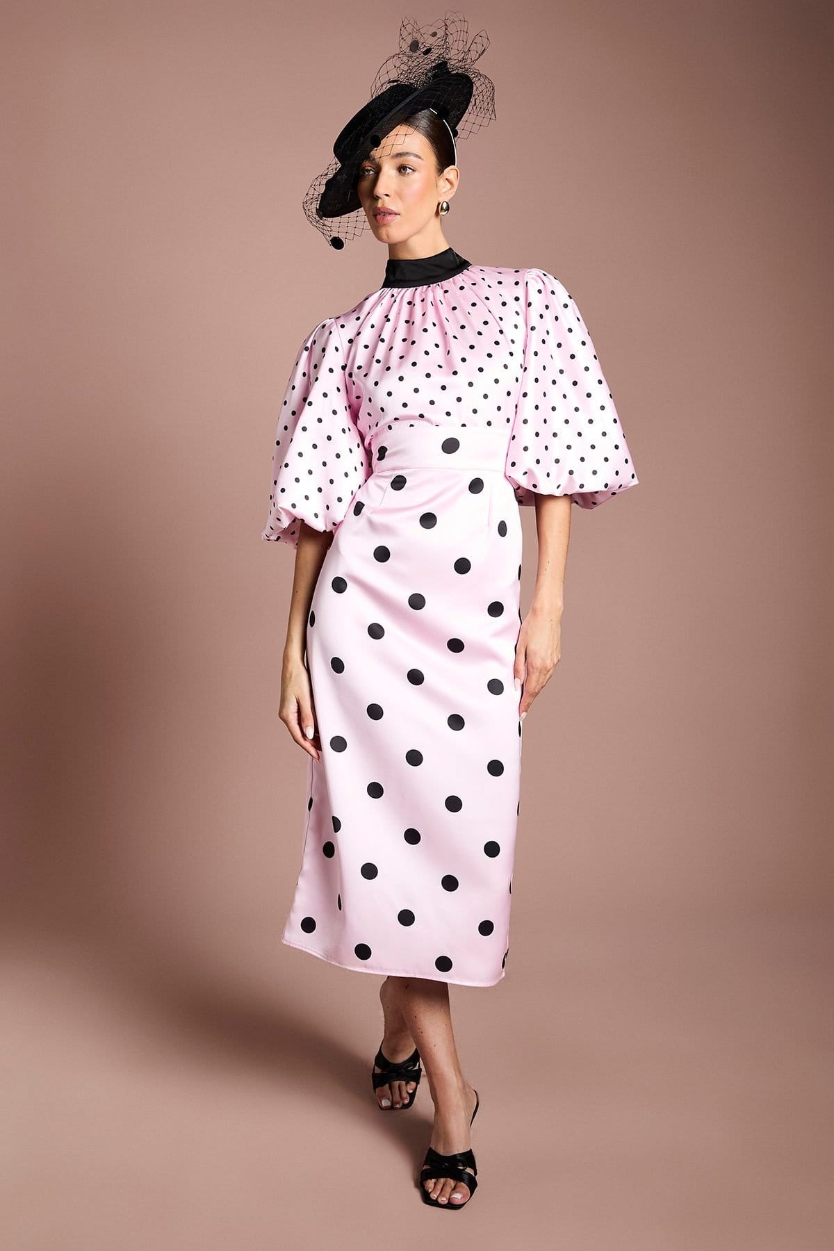 This pink satin midi dress by Coast features dramatic puff sleeves and a high neckline for a sophisticated look. The polka dot pattern adds a playful touch, while the fitted waistline ensures a flattering fit. Ideal for special occasions.