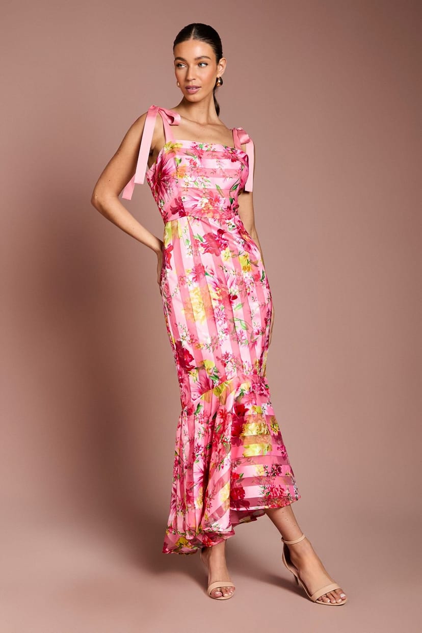The Coast Pink Floral Organza Midi Dress with Bow Shoulders is ideal for evening, party, date-night.