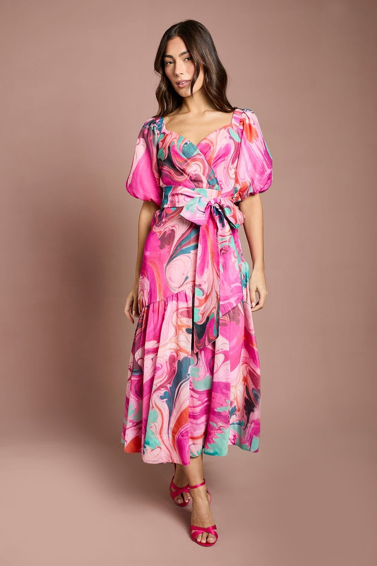 Vibrant pink printed midi dress with puff sleeves and a belted waist. Features a wrap-around design and a flowing silhouette. Ideal for casual outings or summer events.