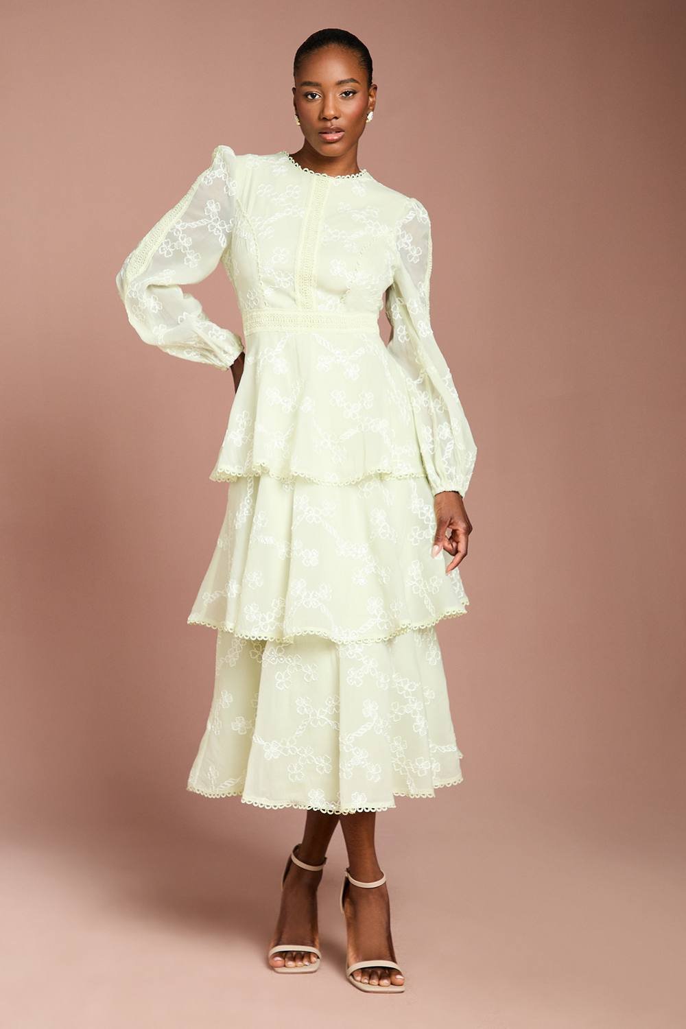 Exquisite embroidered mesh fabric with delicate floral detailing throughout. Elegant tiered midi skirt with scalloped lace trim on each layer. Sophisticated round neckline complemented by billowing long sleeves. Defined waistline creating a flattering silhouette.