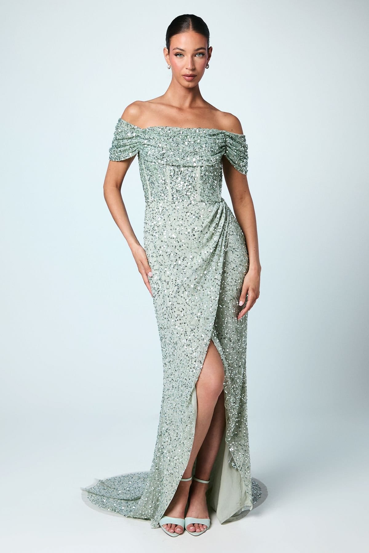Elegant sage sequin Bardot neckline with off-shoulder cap sleeves for a sophisticated silhouette. All-over sequin embellishment that catches the light beautifully. Figure-flattering maxi length with a striking side split for ease of movement. Sleek, body-contouring fit that accentuates your natural curves.