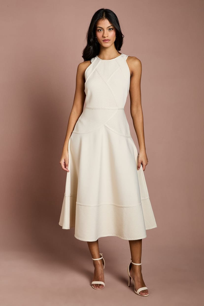 Striking halterneck design with elegant ribbed bandage construction. Sophisticated midi length with a graceful A-line silhouette. Distinctive textured panelling creates visual interest across the bodice. Flattering waistline definition enhances the feminine silhouette. Decorative ribbed hem adds a refined touch.