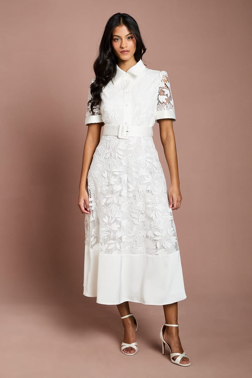 This exquisite white lace trim satin midi dress features an intricate floral lace overlay that creates a stunning textural contrast. The classic collared neckline with a button-down front adds a sophisticated touch. Short sleeves with delicate lace detailing offer elegant arm coverage. A matching fabric belt with a rectangular buckle defines and flatters the waist.