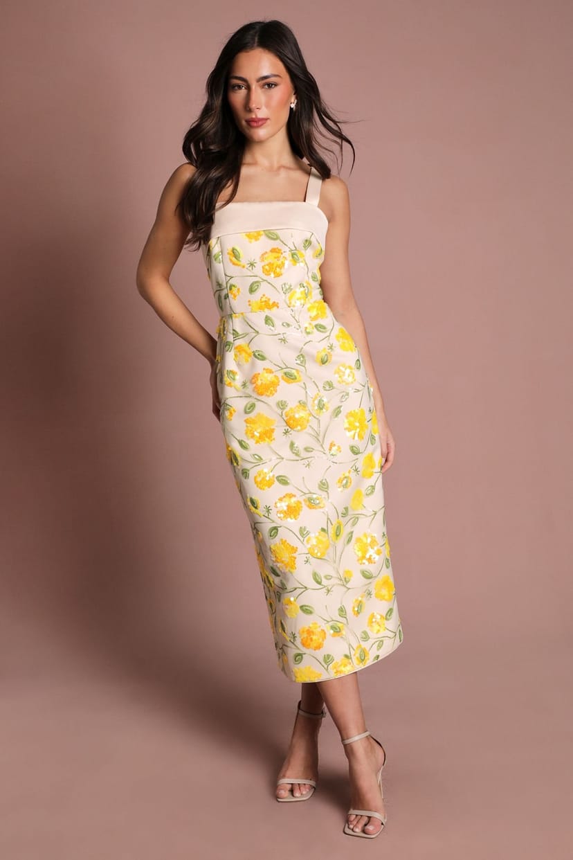 The Coast Yellow Sequin Floral Pencil Dress is ideal for evening, formal, party.