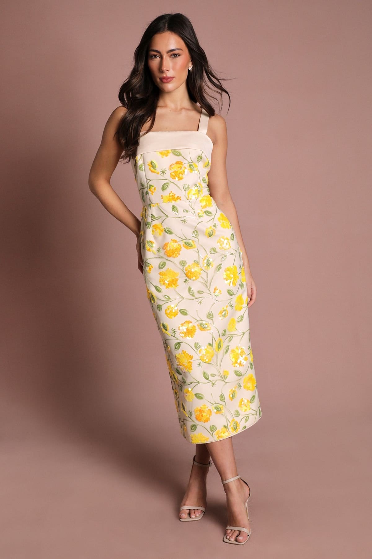 Back to Coast Yellow Sequin Floral Pencil Dress →
