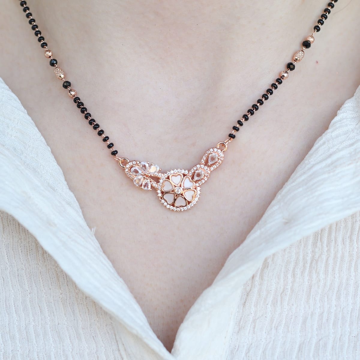The The Colourful Aura Rose Gold Mangalsutra Necklace is made from brass, zircon.