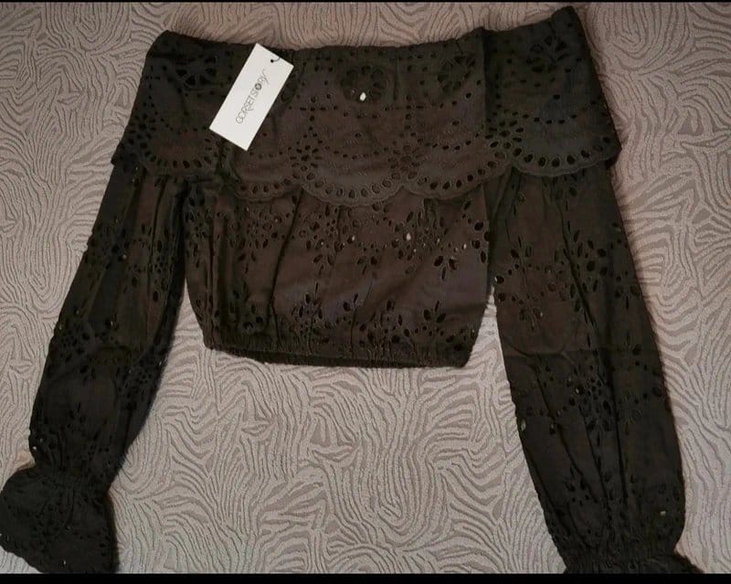 The Corset Story Black Anglaise Embroidery Crop Top is available in sizes S.