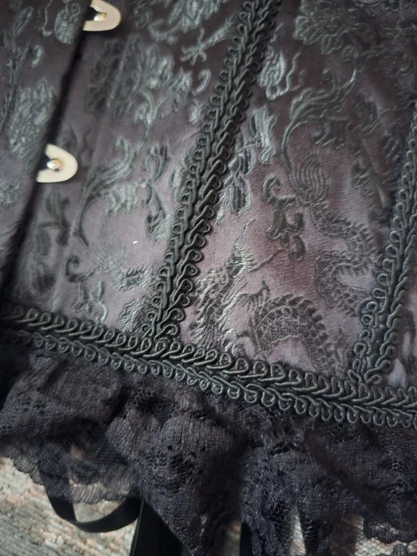 The Corset Story Steel Boned Puff Sleeve Corset Top in Black is made from brocade dobby, lace, steel.