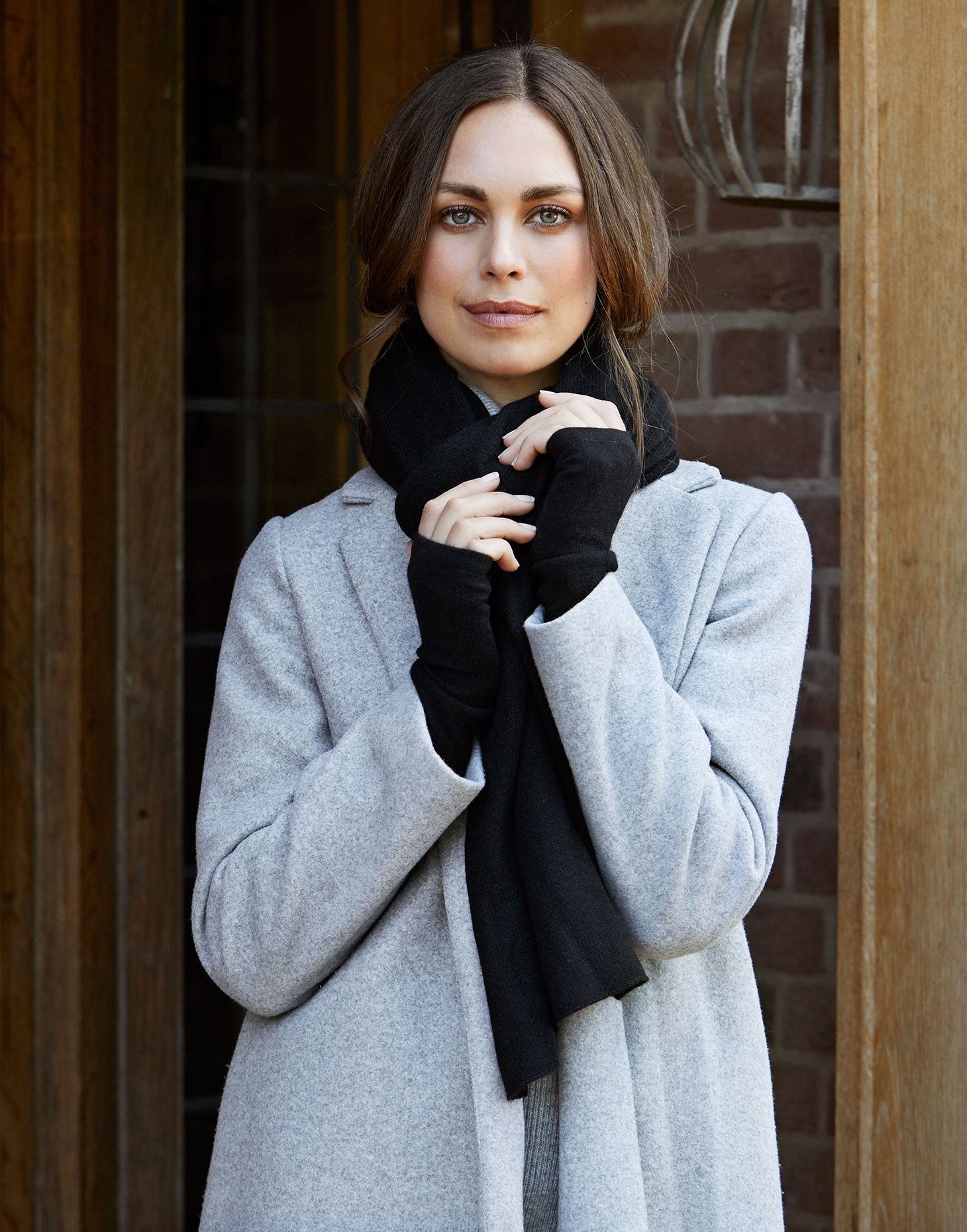 Luxurious cashmere wrap in black, offering four versatile styling options. Ideal for travel and everyday wear, providing warmth and elegance.