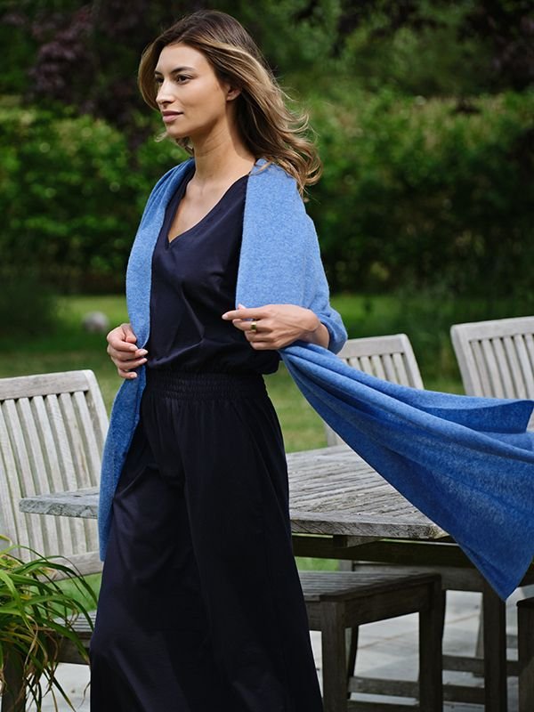 A navy midi dress with a flattering dolman sleeve and a statement shirred waist. Lightweight and easy to wear, perfect for summer.