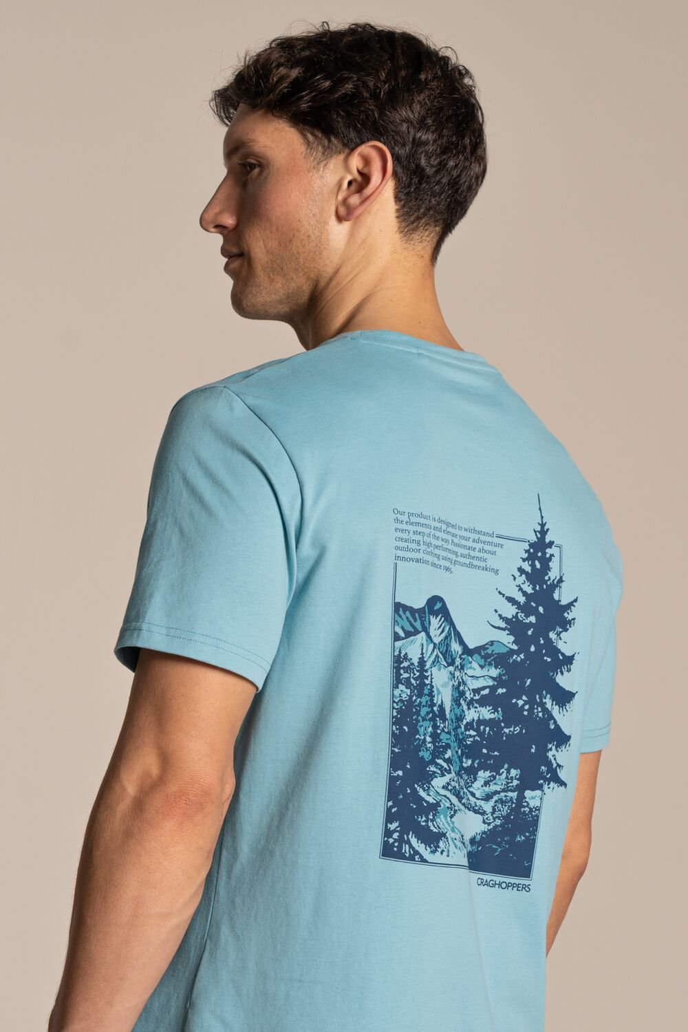Stylish Craghoppers men's t-shirt in blue. Made from a blend of brushed cotton and viscose, this relaxed fit top features a crew neck and a graphic print on the back. Ideal for casual wear and travel.