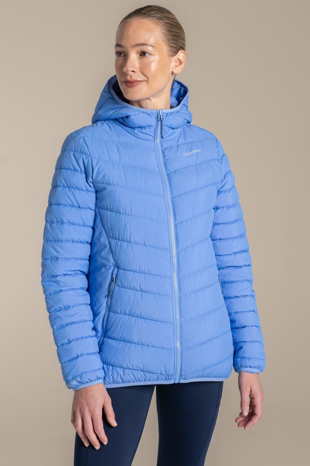 Lightweight insulated jacket from Craghoppers. This bright blue hooded jacket features ThermoPro fill for excellent warmth and is water-repellent. Ideal for outdoor activities.