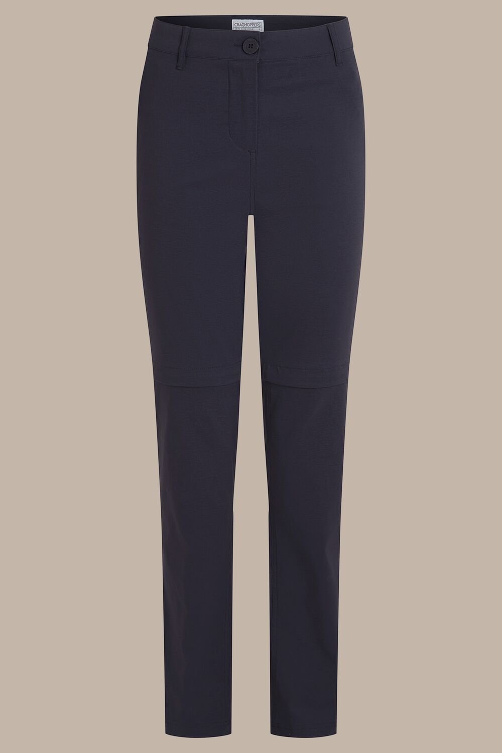 Versatile stretch convertible trousers from Craghoppers. These Dark Navy trousers offer a flattering fit and can be converted to a short-leg option via concealed zips. Ideal for outdoor activities.