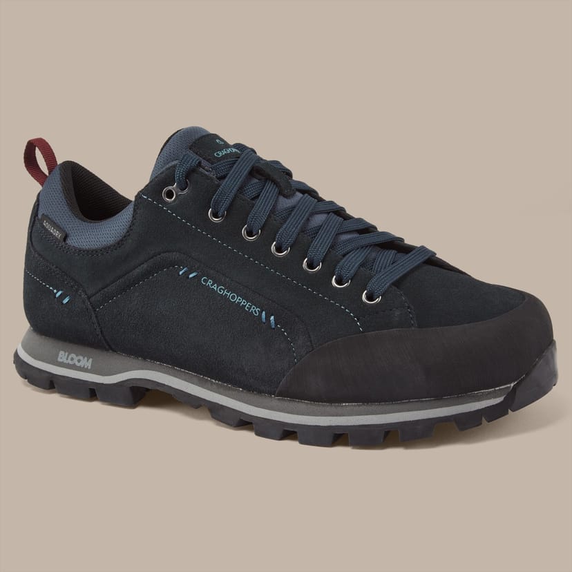 Versatile light grey suede travel shoe from Craghoppers. Designed for both trail and city use, it features a premium Gold Star tannery suede upper with NosiLife collar and waterless dyed mesh lining for insect-repellent and waterproof performance. Equipped with a Vibram sole for excellent traction.