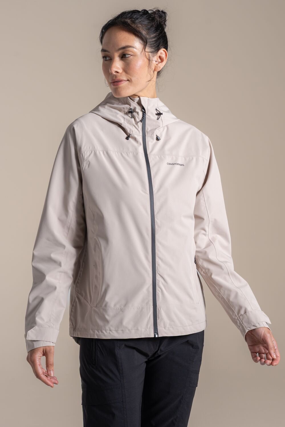 The Craghoppers Women's Zohra Waterproof Jacket in Light Stone is available in sizes 10, 12, 14, 16, 18, 20, 8.